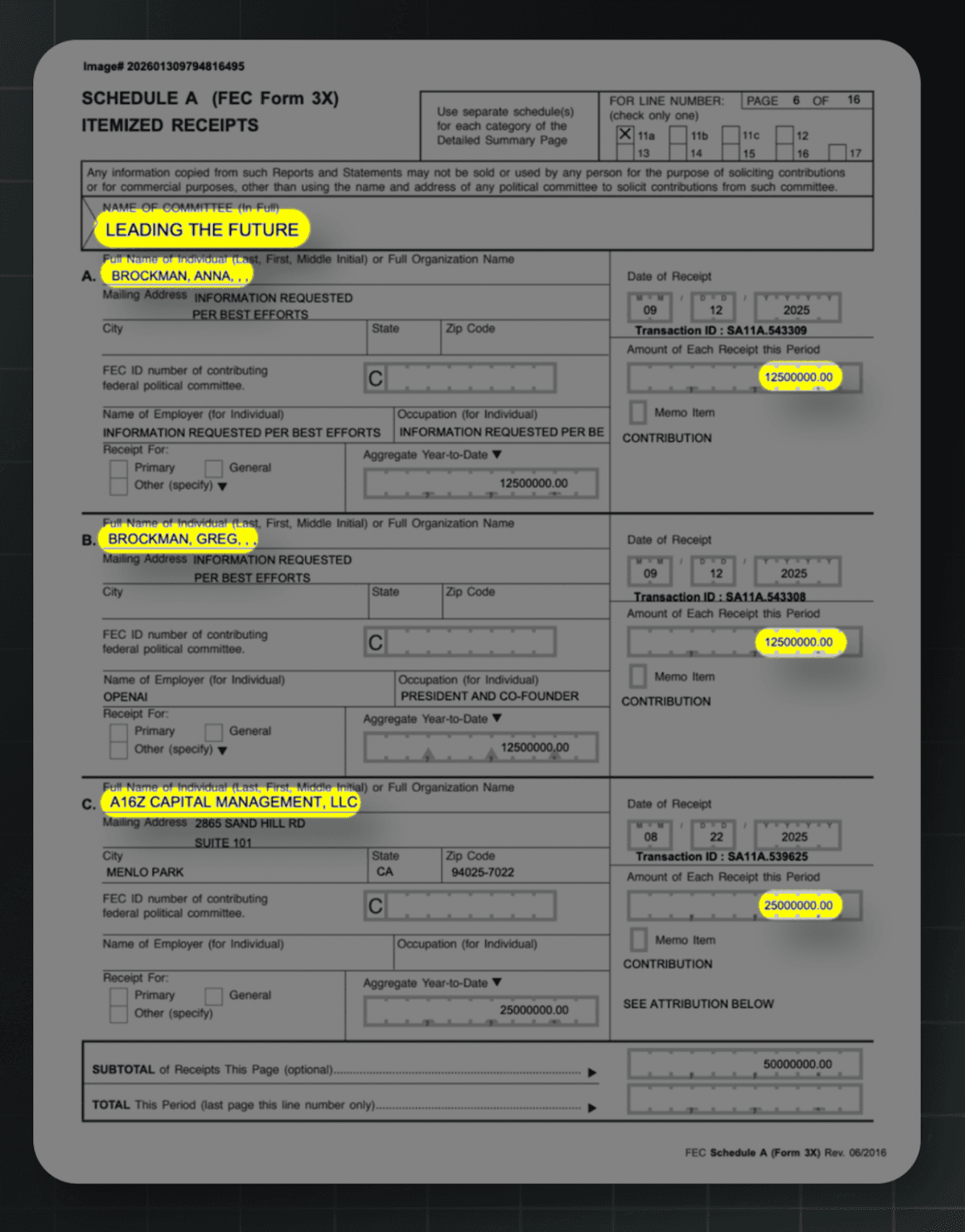 Launched late last year, Leading The Future is an AI industry super PAC that has already raised $125 million with the goal of punishing candidates who have supported AI regulation. Its two largest donors are OpenAI affiliates: Greg and Anna Brockman, the President of OpenAI and his wife, gave $25 million. Another $25 million was given by Marc Andreessen and Ben Horowitz, co-founders of the venture capital firm a16z, which has invested in OpenAI, including co-leading its most recent $122 billion funding round.