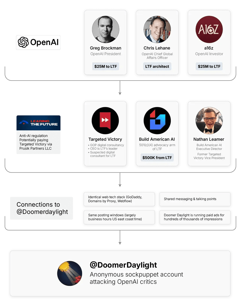 So, recapping the case so far: Late last year, OpenAI’s president, its chief global affairs officer, and a major financial backer, a16z, all teamed up to create a super PAC opposing AI legislation. That super PAC works alongside a 501(c)(4) advocacy arm and has ties to Targeted Victory. Both of those firms share surprising connections with an anonymous sockpuppet account that attacks their ideological opponents in direct and misleading ways, in addition to running paid ads promoting its messages.