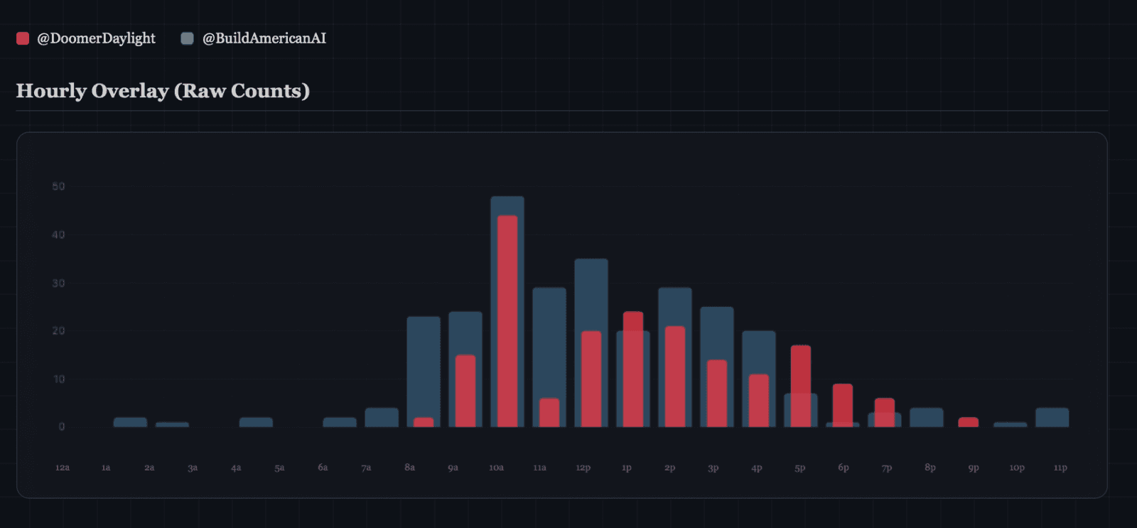 The Doomer Daylight and Build American AI Twitter accounts also have suspiciously similar posting patterns and arguments. I analyzed virtually all of the public tweets on their accounts. The nearly 500 combined tweets reveal patterns consistent with a single operator switching between two accounts. Both post primarily, but not exclusively, on weekdays during U.S. Eastern time business hours, with the same distribution which peaks around midday and trails off into the evening. Both go nearly silent on Sundays.