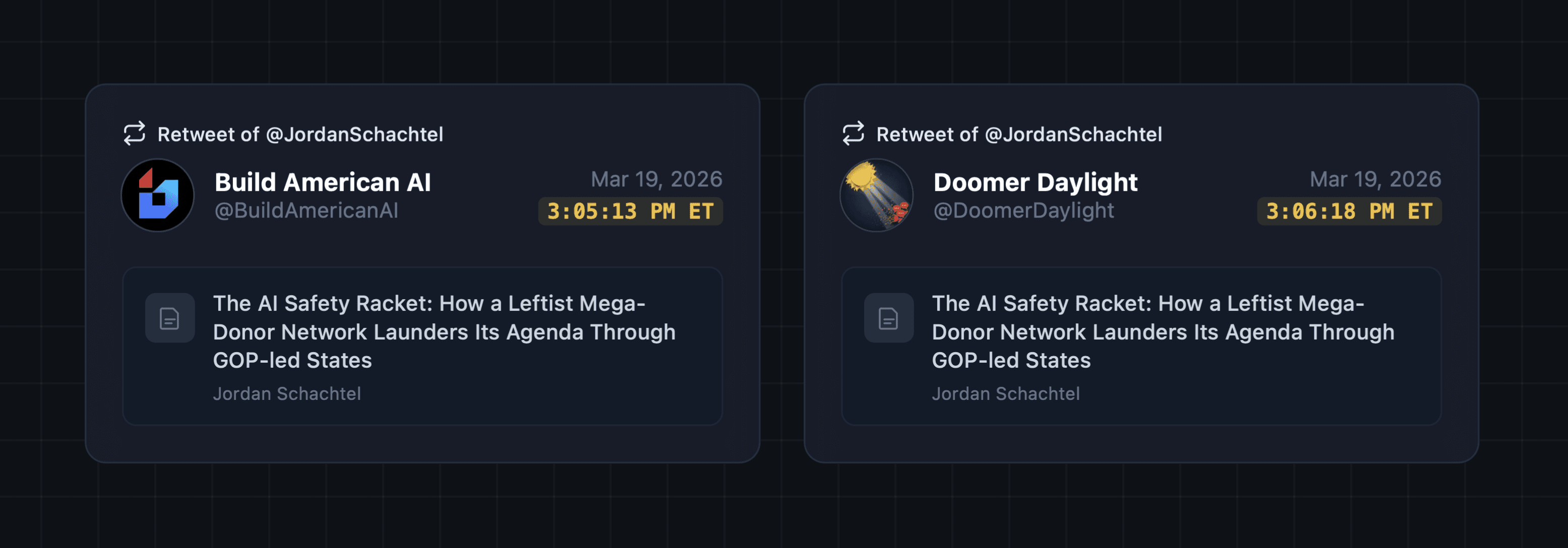 The most striking example involves an article (parroting the same messaging) that was authored by journalist Jordan Schachtel and, soon after publication, retweeted by both the Doomer Daylight and Build American AI accounts within about a minute of each other, consistent with one admin logging out of account A and into account B for a quick retweet.