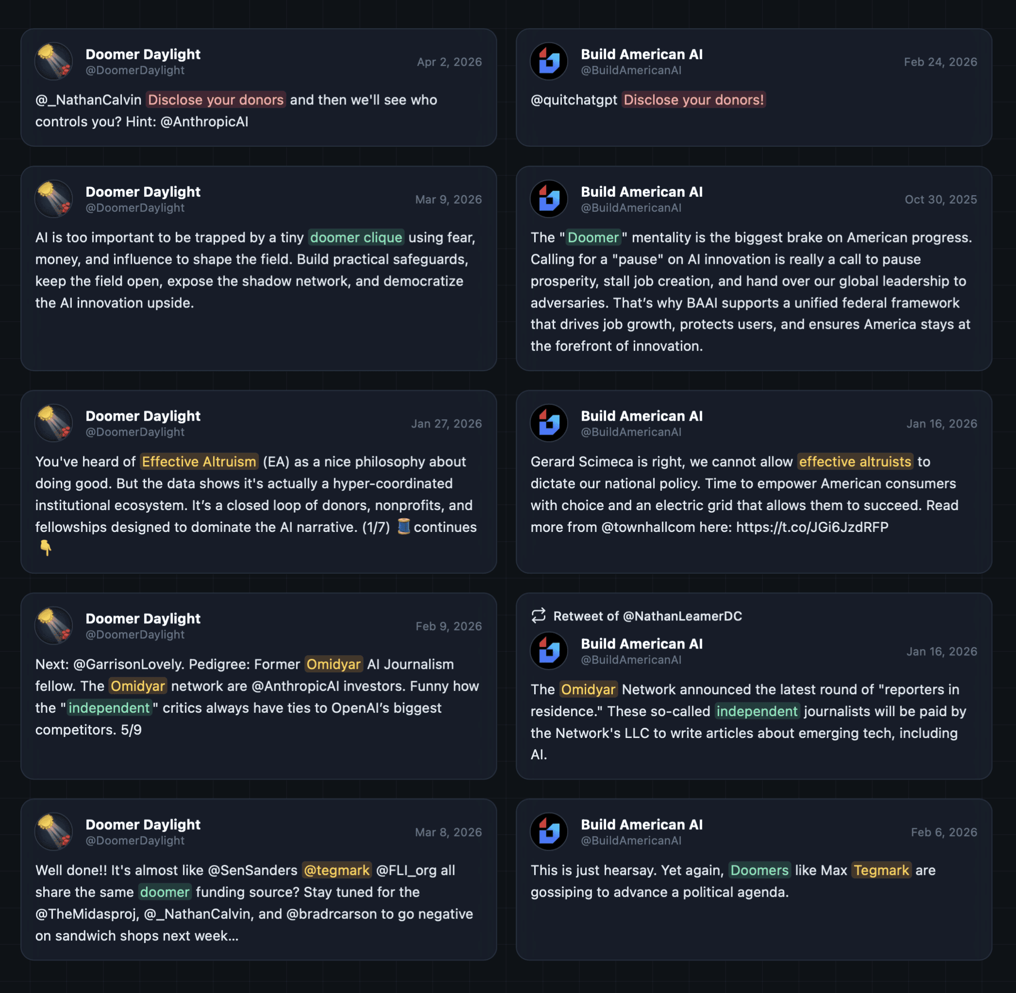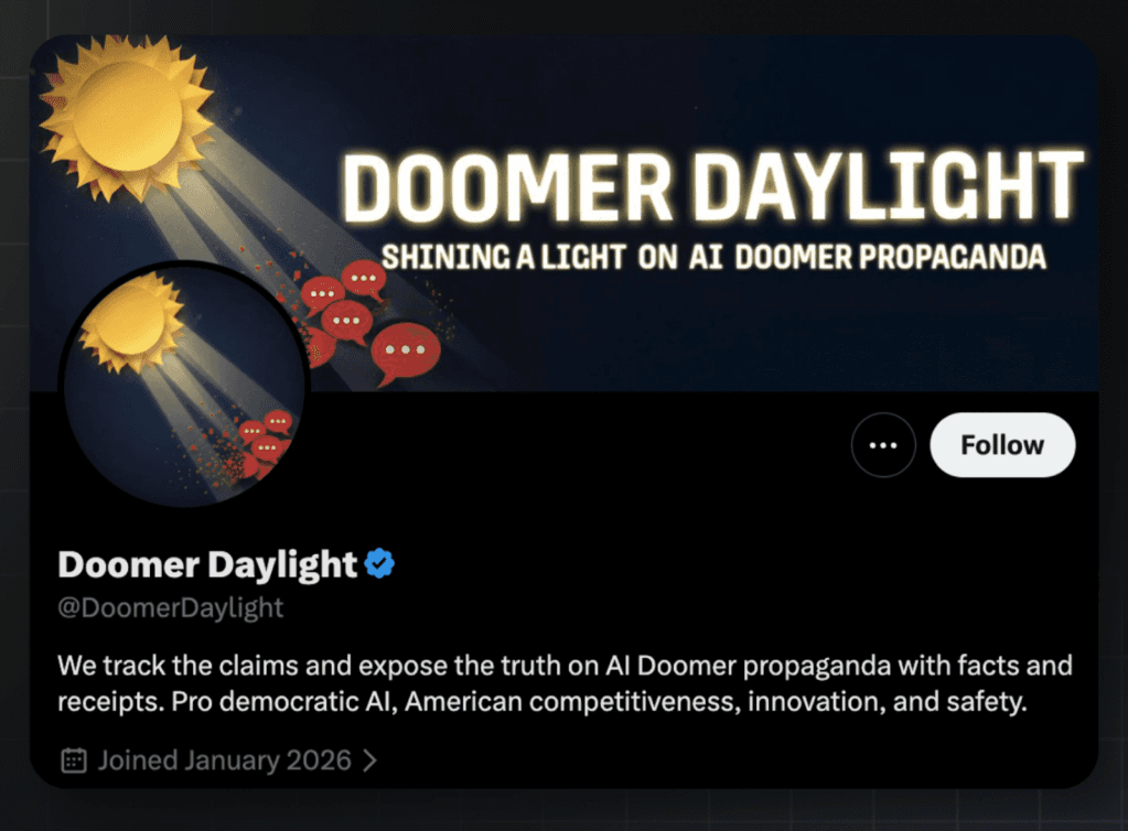 The Doomer Daylight account frequently uses the same phrases and talking points as the Build American AI account, demanding critics “disclose your donors” and criticizing supporters of AI regulation as “doomers” or “effective altruists.”