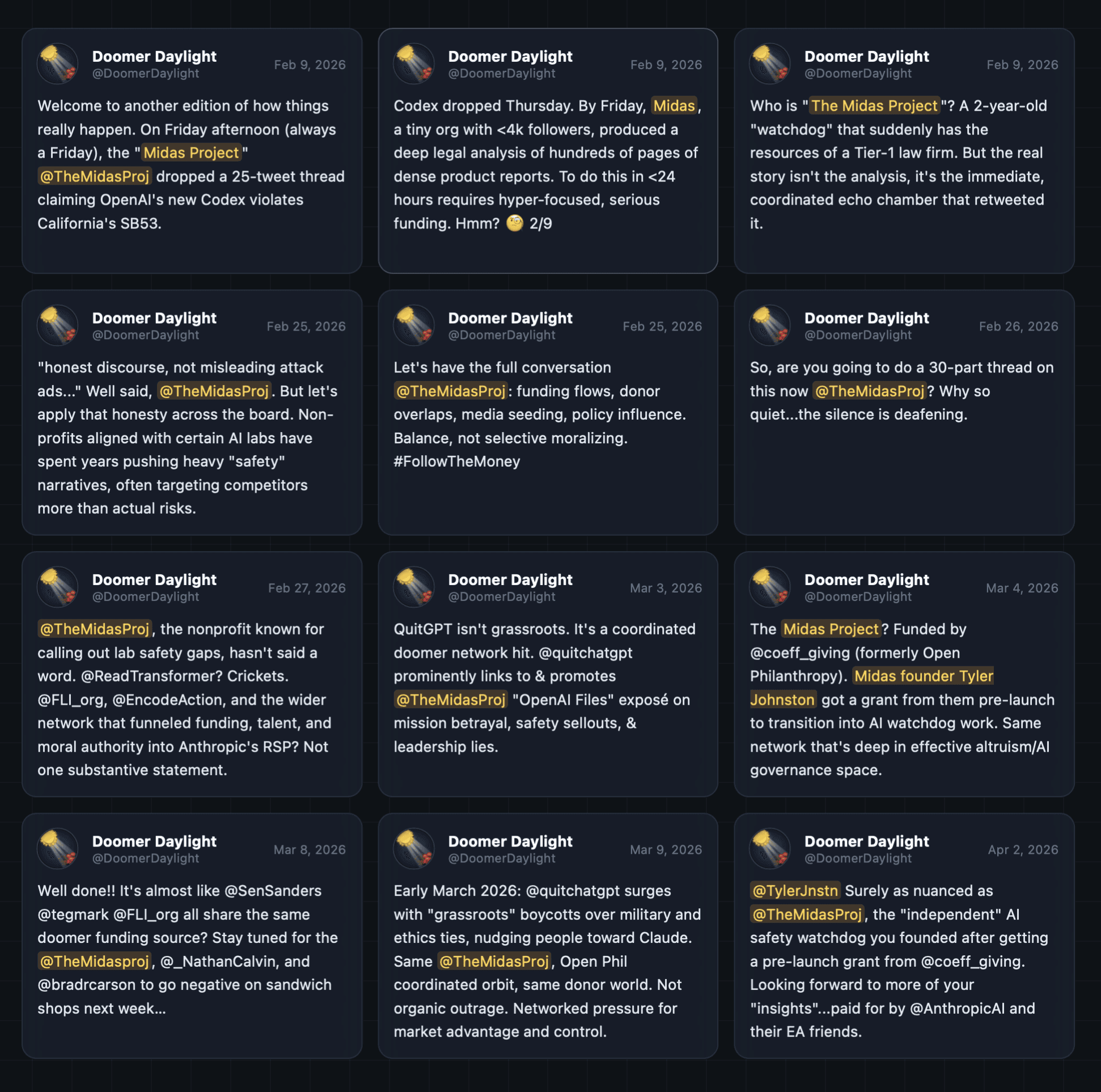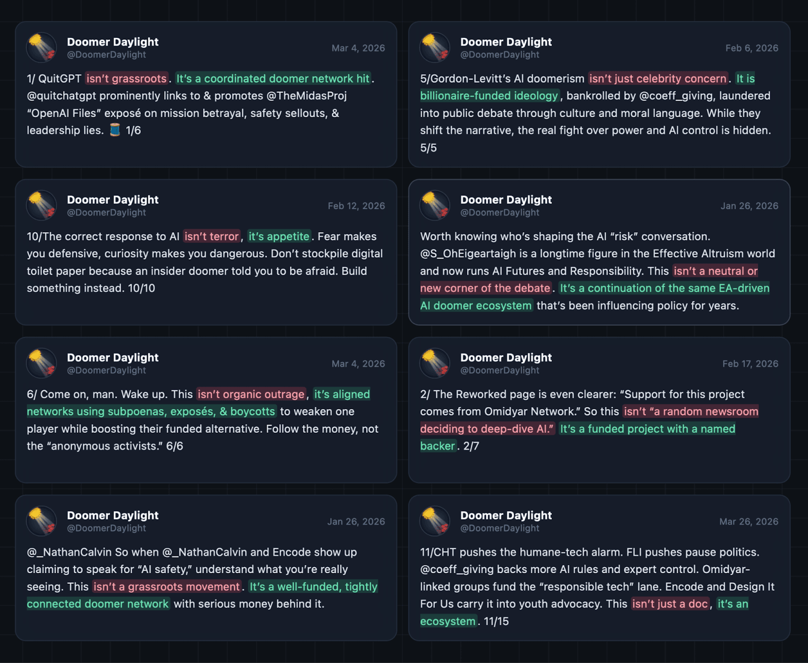 Our organization wasn’t the only target — the account, anonymous but operating under the handle “Doomer Daylight,” goes after a rotating cast of nonprofits, researchers, and journalists, accusing them of being part of a well-funded “doomer network" with ties to OpenAI’s competitors.