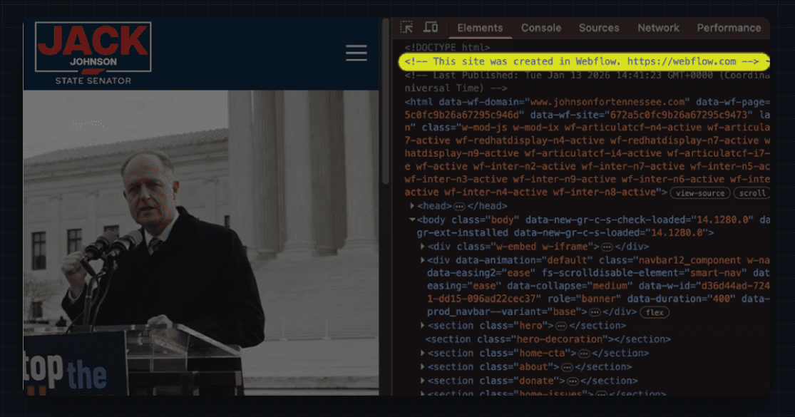 Interestingly, the source code of the site also has a specific line of code — a timestamp with particular formatting — which indicates that it was built using the visual page builder Webflow, a somewhat niche platform that is only used by about 1% of all sites on the internet.
