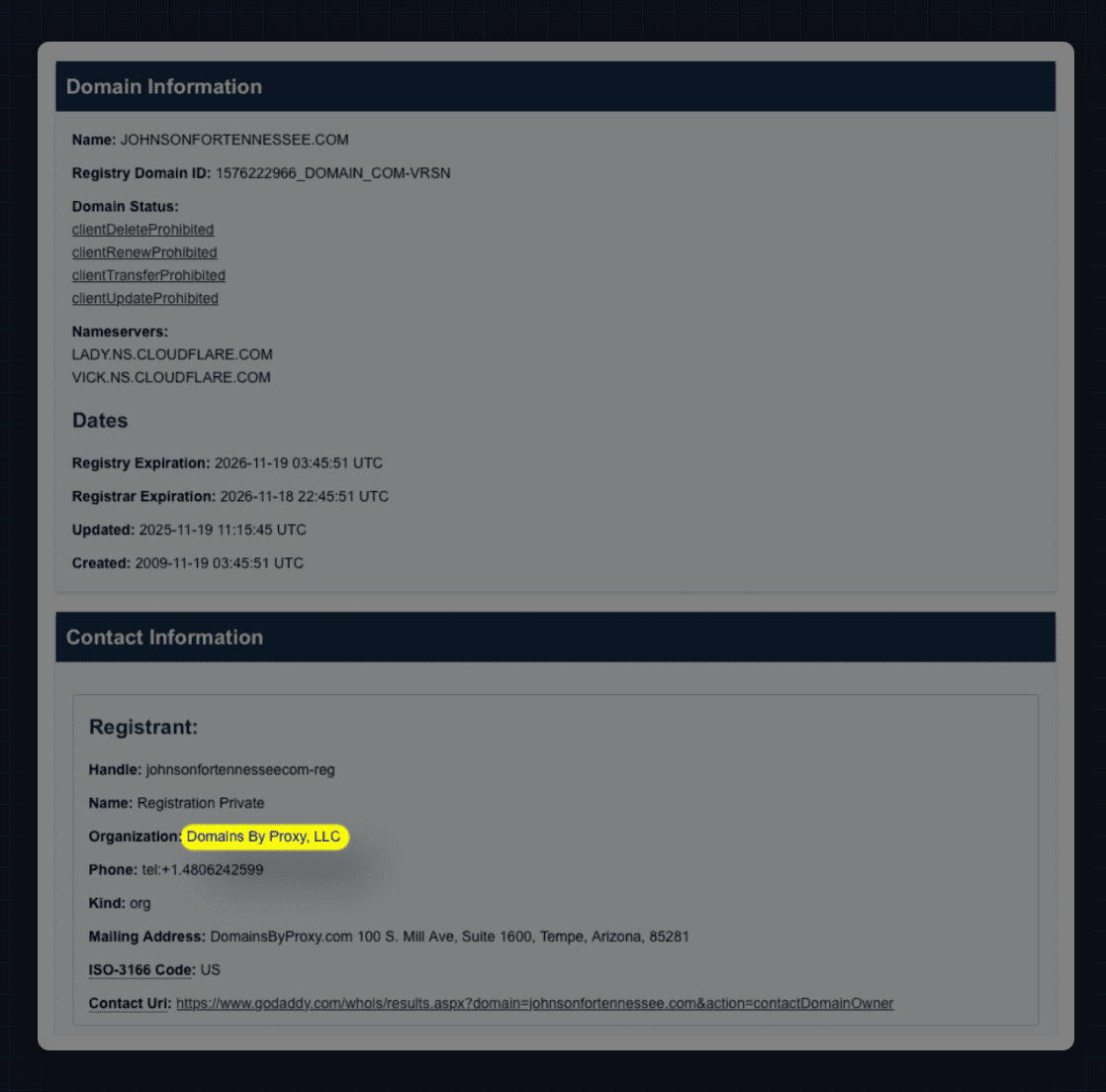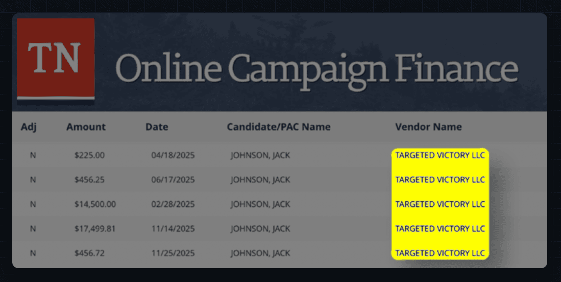 For example, consider johnsonfortennessee.com — the campaign site for a Tennessee Senate candidate whose Federal Election Commission (FEC) filings show payments to Targeted Victory. The campaign website uses the same domain registrar/privacy provider as other Targeted Victory sites and has a privacy policy that overlaps with BuildAmericanAI.org perhaps more than any other.