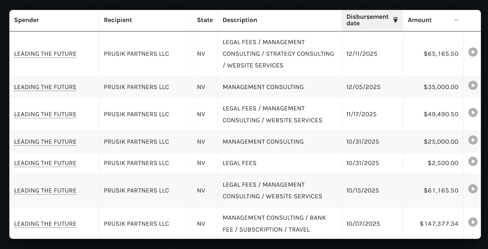 According to FEC filings, Leading The Future has disbursed over $11 million. Of that, $500,000 went to Build American AI (one possible way that Targeted Victory is getting paid to work on the PAC’s behalf). Another $10 million went to the two partisan affiliate PACs — American Mission and Think Big — which have been spending millions on political attack ads. But roughly $385,000 went to a company called Prusik Partners LLC in Henderson, Nev., for services described as "management consulting," "website services," and "strategy consulting."