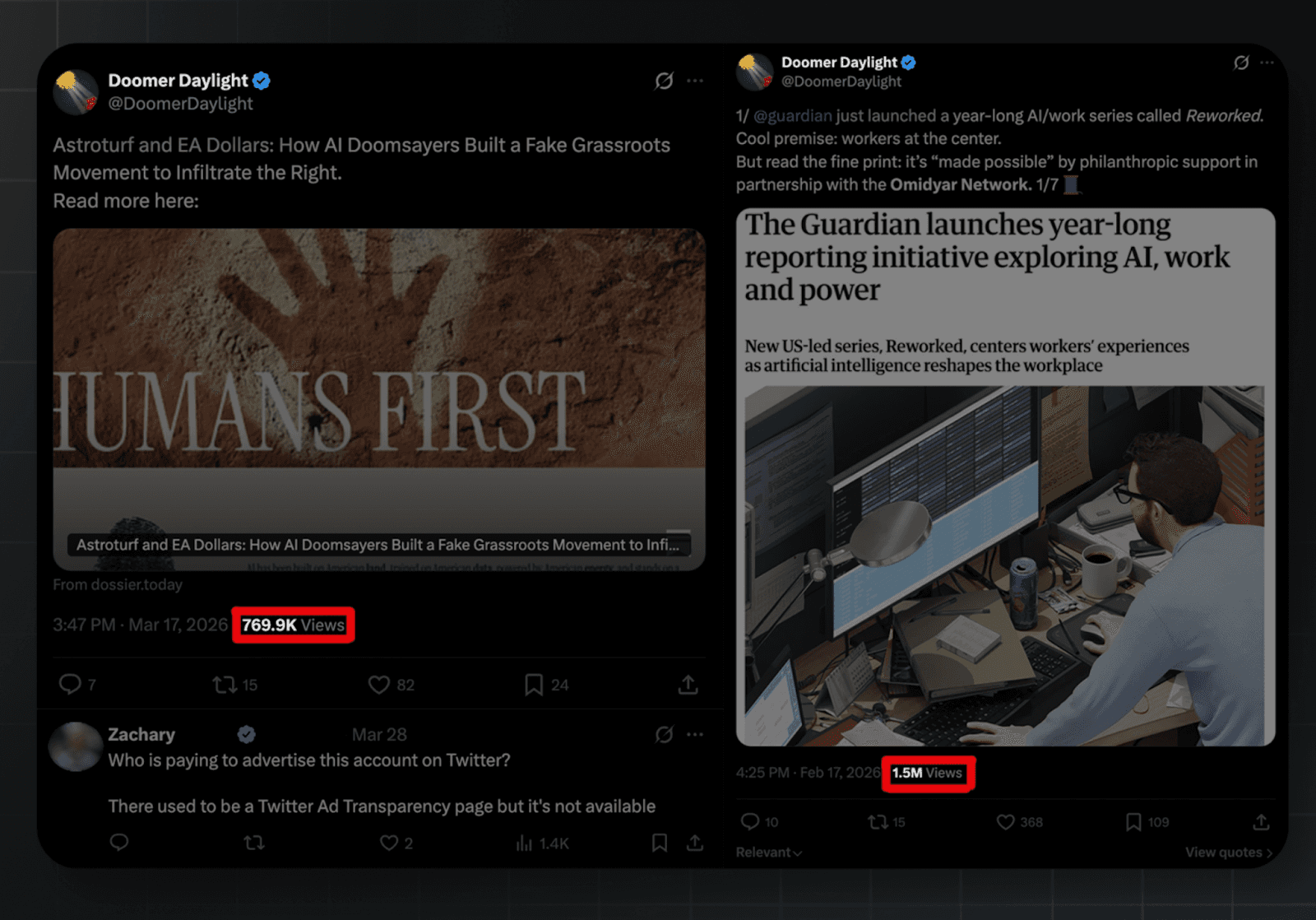 I should emphasize that the Doomer Daylight account has not had much success in its three months of posting, receiving zero likes on most of its tweets, and only amassing around 70 followers. In light of this, and perhaps suggestive of big money behind the account, Doomer Daylight runs paid ads on Twitter, pushing views on certain posts into the hundreds of thousands. One post promoting a Jordan Schachtel article has accumulated nearly 1 million views — wildly out of line with the account's negligible organic reach. Whoever is behind @DoomerDaylight is spending real money to get these talking points in front of people.