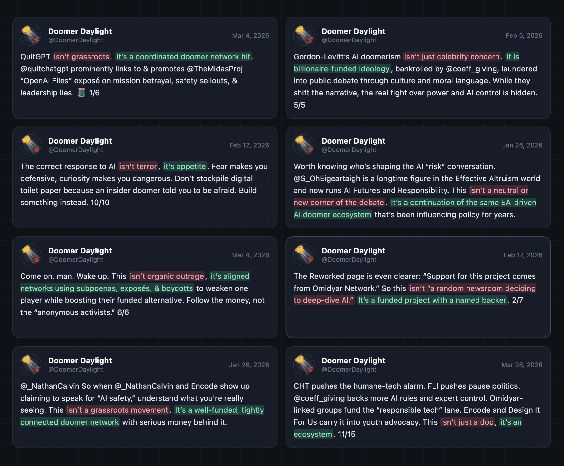Our organization wasn’t the only target — the account, anonymous but operating under the handle “Doomer Daylight,” goes after a rotating cast of nonprofits, researchers, and journalists, accusing them of being part of a well-funded “doomer network" with ties to OpenAI’s competitors.