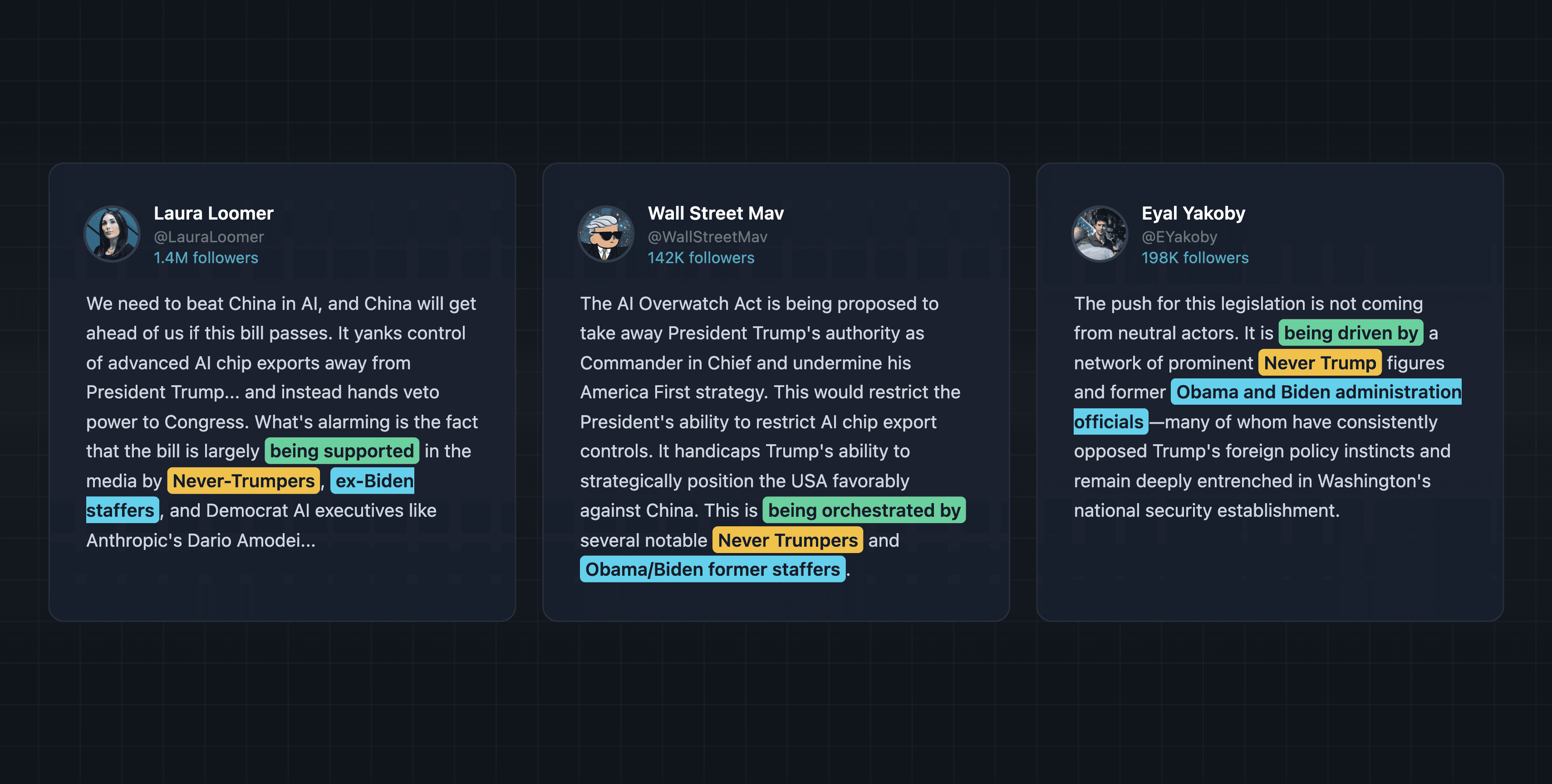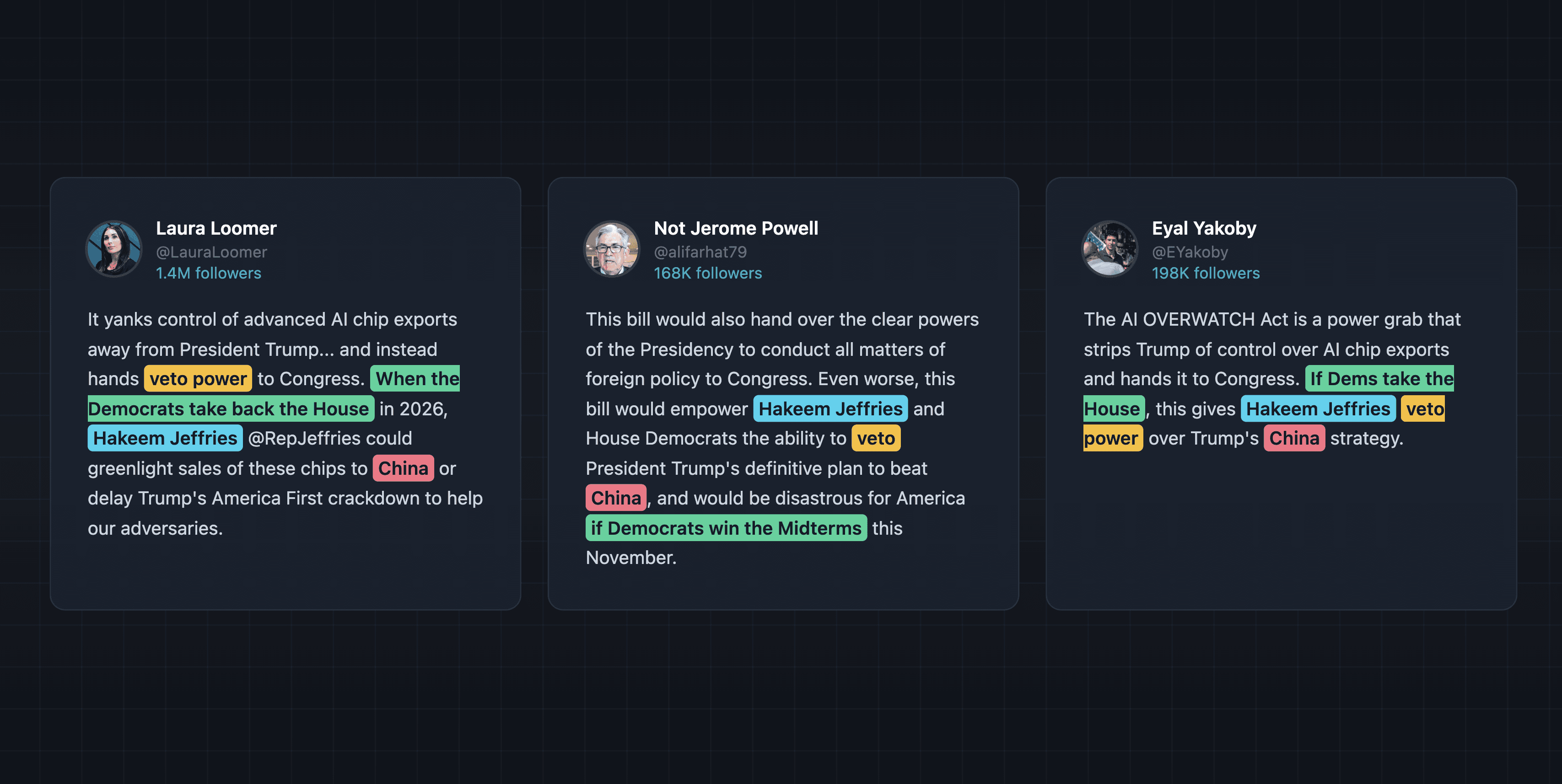 The AI OVERWATCH Act campaign looks awfully similar. And the stakes are high: the bill has implications for Nvidia's ability to sell advanced AI chips to China, a market worth billions of dollars to the company. If someone wanted to kill this legislation before it gained momentum, a coordinated influencer campaign — using conservative figures to pressure the Republicans running Congress — would be one way to do it.