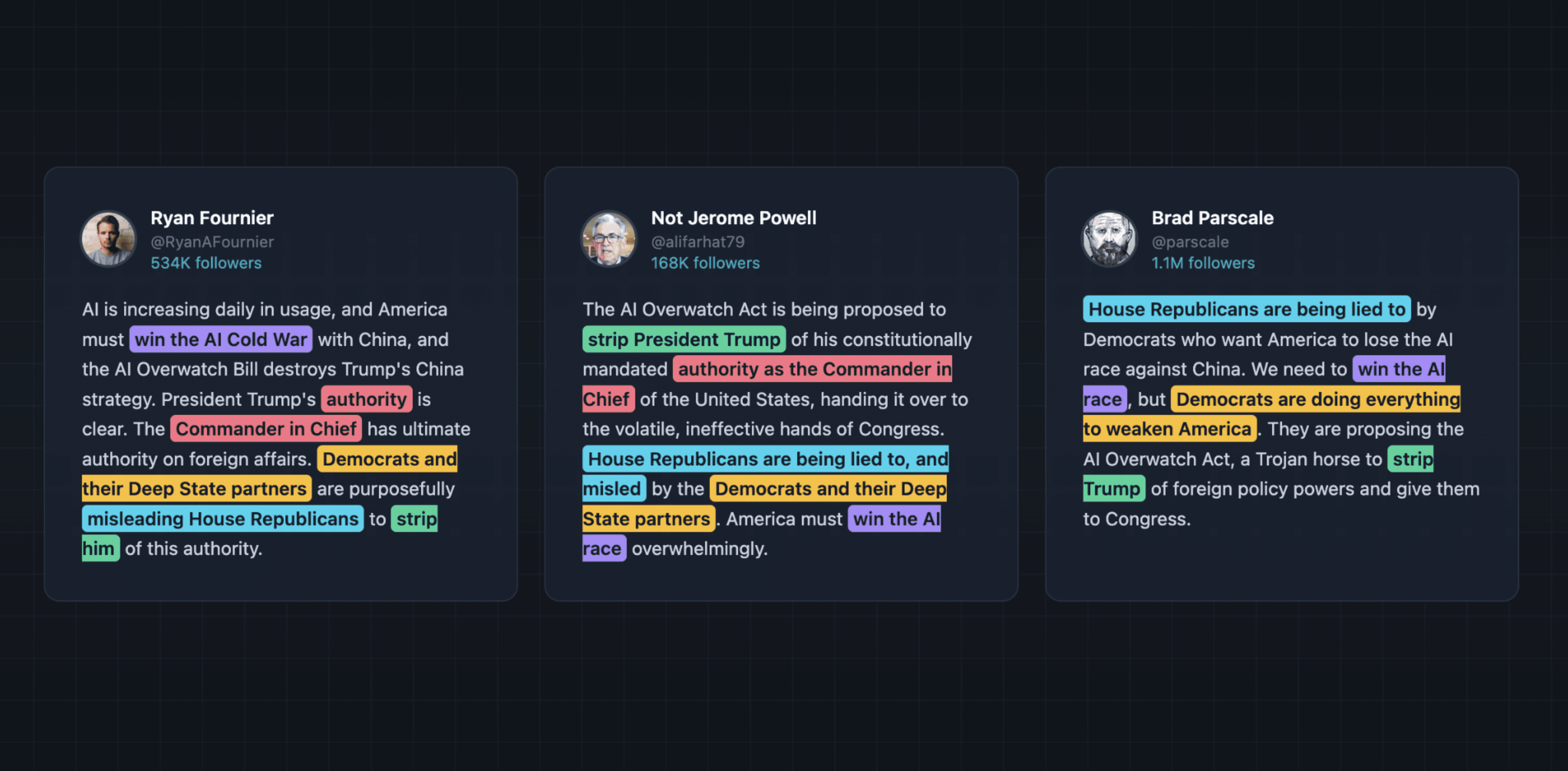 Two (Joey Mannarino and “Not Jerome Powell") even had the same subtle typo in the “Al OVERWATCH Act” — using a lowercase “L” in “AI” instead of an uppercase “I”. This is a rare typo but it’s easy to miss when it occurs, so it’s more likely to be repeated if you’re copy-and-pasting from the same text.