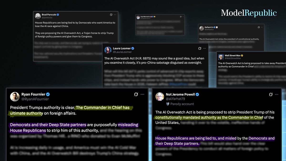 Suspicious similarities in posts from over a dozen conservative influencers including Laura Loomer, Brad Parscale, and Ryan Fournier hint at a coordinated-yet-slapdash effort to stop the AI OVERWATCH Act.